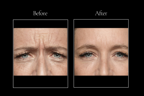 Before: visible frown lines and expression lines at rest. After: smoother skin and softer expressions, especially between the brows, around the eyes, and across the forehead. Results look natural, not frozen, with peak improvement typically seen around 2 weeks.